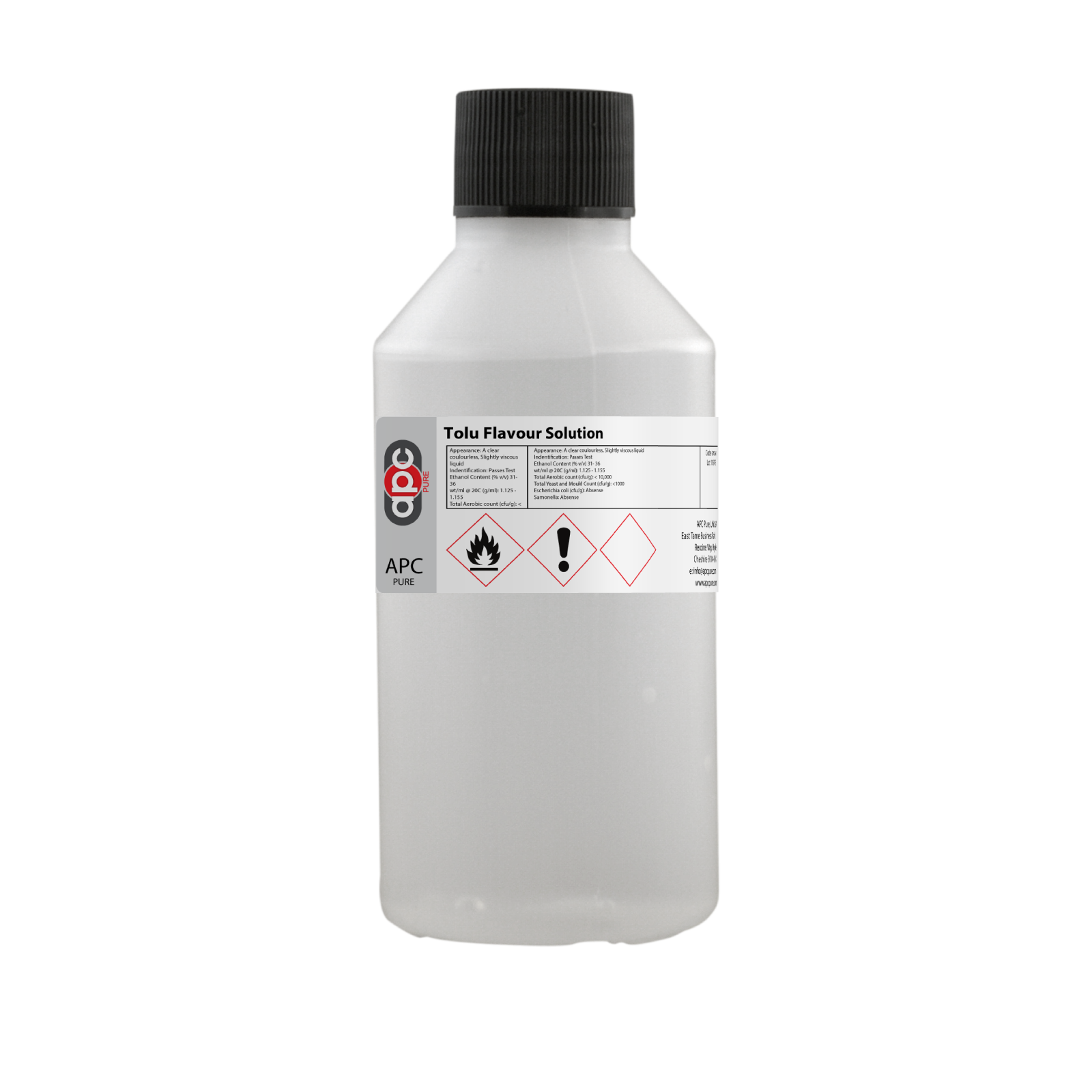 Tolu-Flavour Solution BP is a solution prepared according to British Pharmacopoeia recipe, Consisting mainly of cinnamic and benzoic acids in sweetened ethanolic water.